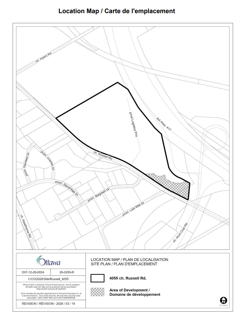 A new Site Plan Control application has been submitted for 4055 Russell Road in the National Capital Business Park. The proposal seeks to develop a one-storey industrial building with a total gross floor area of approximately 3,100 square metres on a currently undeveloped portion of the site.